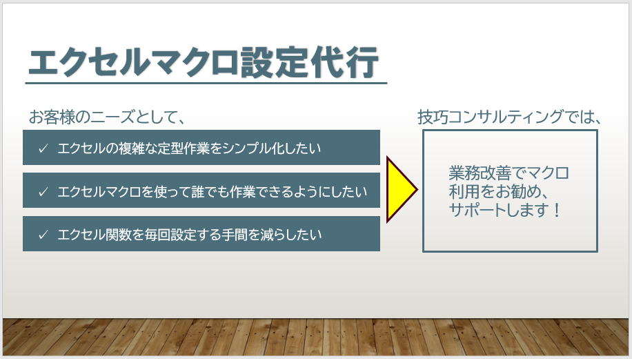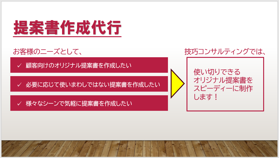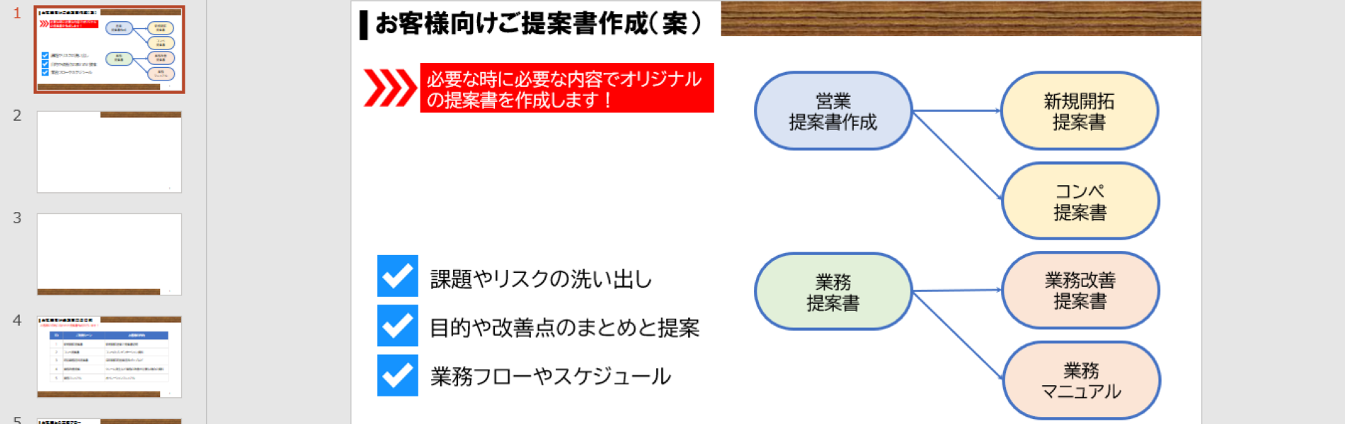 パワーポイントやエクセル、ワードを使い、提案書や資料の作成を代行します。