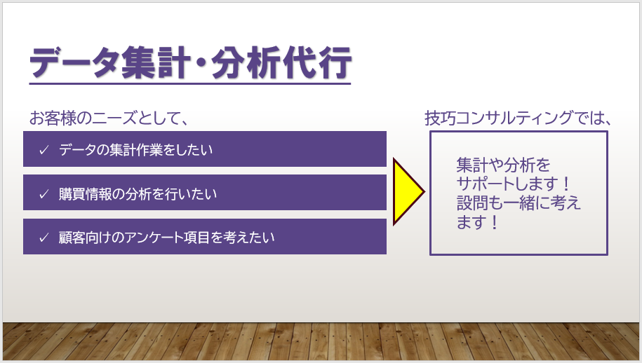 アンケートやデータ入力結果・購買情報などを集計・分析代行致します。